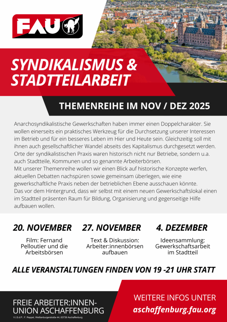Mit unserer Themenreihe wollen wir einen Blick auf historische Konzepte werfen, aktuellen Debatten nachspüren sowie gemeinsam überlegen, wie eine gewerkschaftliche Praxis neben der betrieblichen Ebene ausschauen könnte.